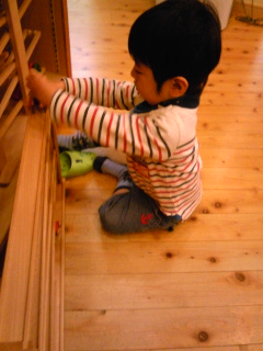 「ももか、ピーラーが好き」と言って張り切ってます。 「リンゴ、リンゴ!」と側で見つめるのはこうちゃん(^_^)