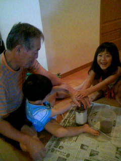 じいじとの豆挽き。 一年くらい前までは、ももちゃんの仕事でした。 今やこうちゃんがメインです。 じいじは・・・大変だろぅなあ(^^ゞ