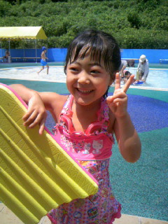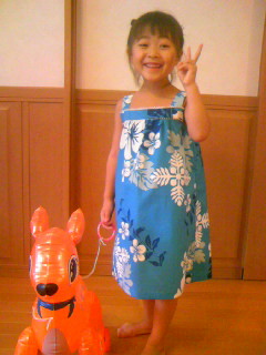 完成! 120センチの型紙で作りました! このアロハ生地、実は50円のハギレ。 小学生になる来年を見越して、内ポケットをつけました(ハンカチで必要になる?)。 鮮やかな水色がよく似合ってるね(^-^)v