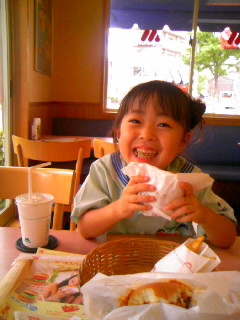 幼稚園に迎えに行きました! 一日ぶりにあった萌々ちゃんは、髪を可愛くしてもらってまた新鮮に見えました 『127秒のトンネルがあった。33秒のもあったよ』と話してくれた。 バスの中も賑やかだったみたい♪ そのまま萌々ちゃんの大好きなモスでランチしています