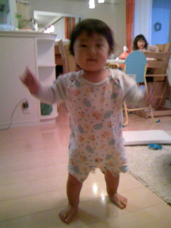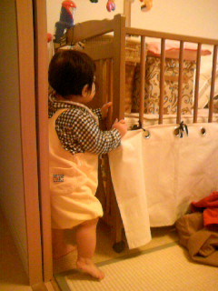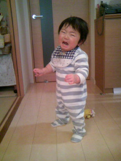 何やら狭いところに入って伝い歩き 向かい合って両手を引いてあげたら洗面所~リビング入口までの廊下を一緒にあんよ、できました!! ちょっぴり進化中のこうちゃんです(o^-')b