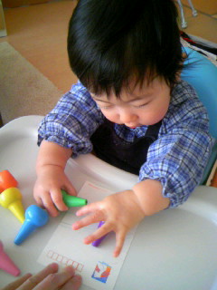 お祝いでいただいたクレヨンに触ってます。「持ってる持ってる持ってる!」と言うと手を振ってご機嫌なこうちゃんです。