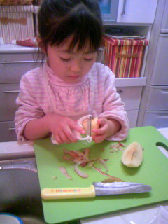 ピューラー&包丁でリンゴの皮むきに挑戦中の萌々ちゃん。 作業しながらも常に口は動いてます('◇')