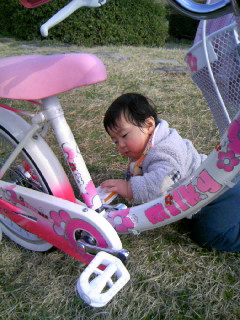 パパと自転車の練習中。 4歳のたっくんと。棒の奪い合いしてます。